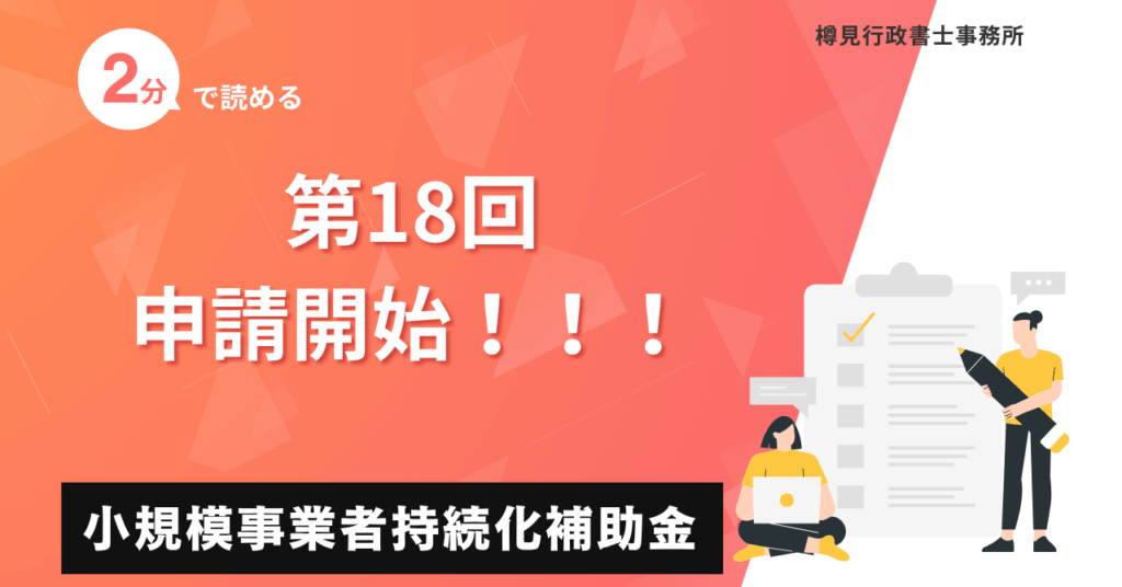 持続化補助金<第18回> 申請が開始されました! こんにちは、行政書士の樽見です。本日より「小規模事業者持続化補助金<第18回>」の申請受付がスタートしました。 補助金を活用して販路開拓や業務効率化をお考えの事業者様にとって、今年度最後のチャン...